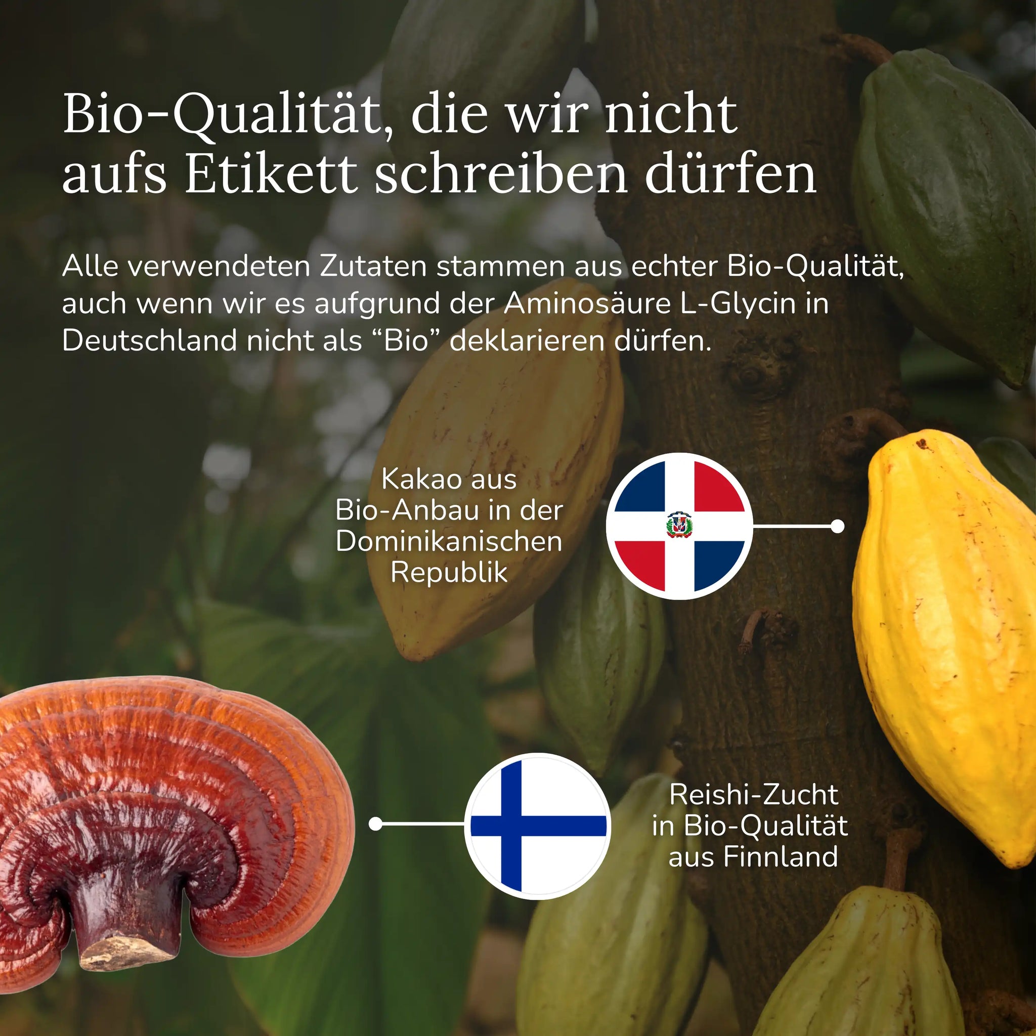 Aus rechtlichen Gründen dürfen wir den Waldkakao in Deutschland nicht als „Bio-Produkt“ kennzeichnen oder mit einem entsprechenden Siegel versehen. Der Grund dafür ist die Aminosäure Glycin, die wir bewusst als wertvollen Bestandteil unserer Rezeptur einsetzen. Um diese besondere Kombination möglich zu machen, verzichten wir auf die offizielle Bio-Deklaration.