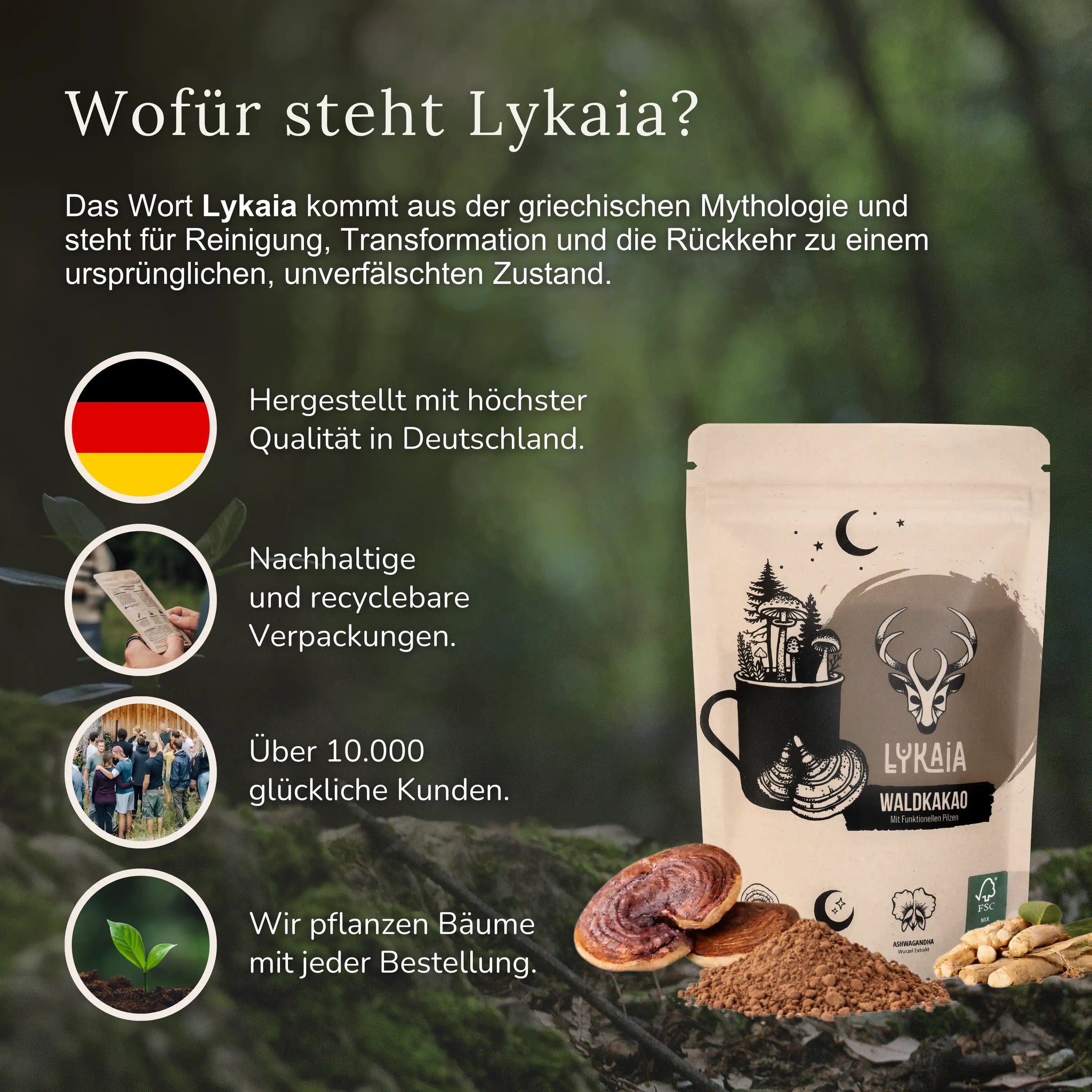 Unser Waldkakao ist ein bewusst komponiertes Kakaogetränk für alle, die Kakao nicht nur trinken, sondernqualitativ genießenmöchten. Er vereint hochwertigen Kakao mit dem Reishi-Vitalpilz, Ashwagandha und der Aminosäure L-Glycin.